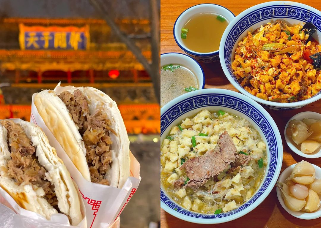 1.肉夾饃:被稱為「中國漢堡」,外酥內軟的饃配上多汁的臘汁肉,一口下去滿滿的幸福感!推薦去樊記或老米家品嚐最地道的口味。